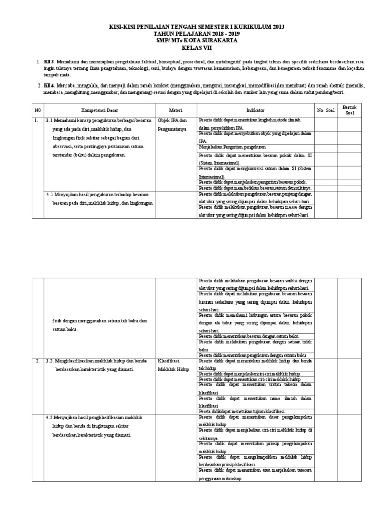 Format Lembar Kumpulan Kisi-kisi Soal Ipa Kelas 7 Smp K13