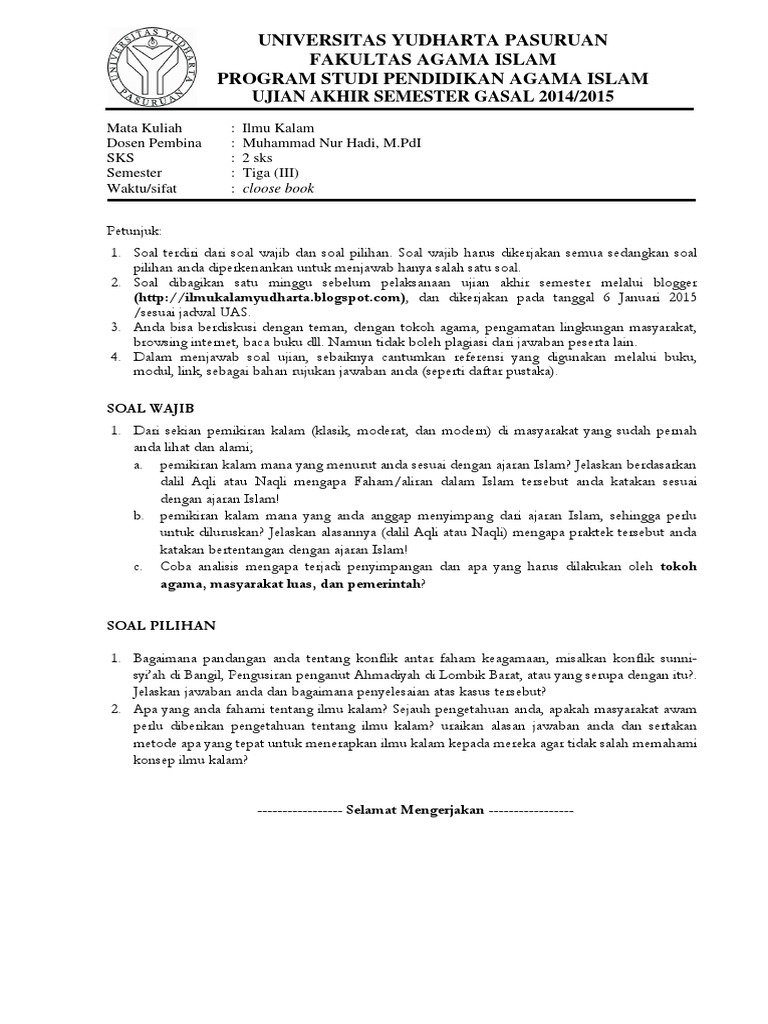 Kumpulan Soal Ilmu Kalam Dan Jawaban