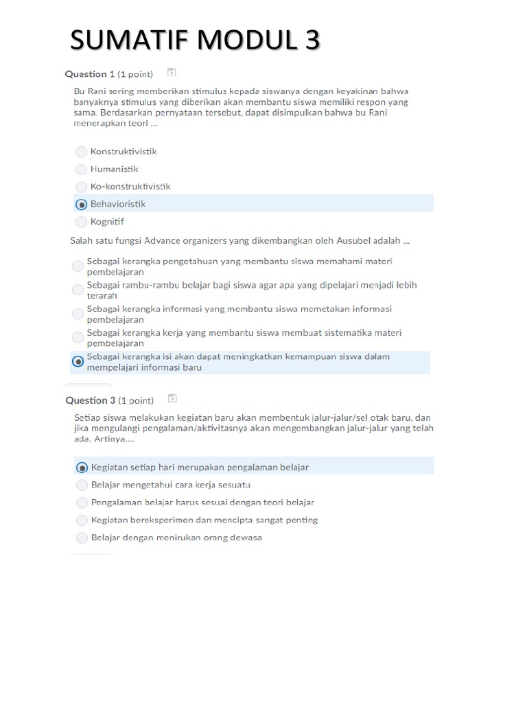SUMMATIVE TEST M3TES SUMATIF M3 PROFESIONAL. Modul 3 ini lumayan banyak guys karena memuat teori-teori belajar yang wajib dikuasai guru. Ingat ya kunci ini hanya contoh saja niatkan untuk belajar dan jangan lupa kroscek di modul juga supaya materinya selalu ingat.