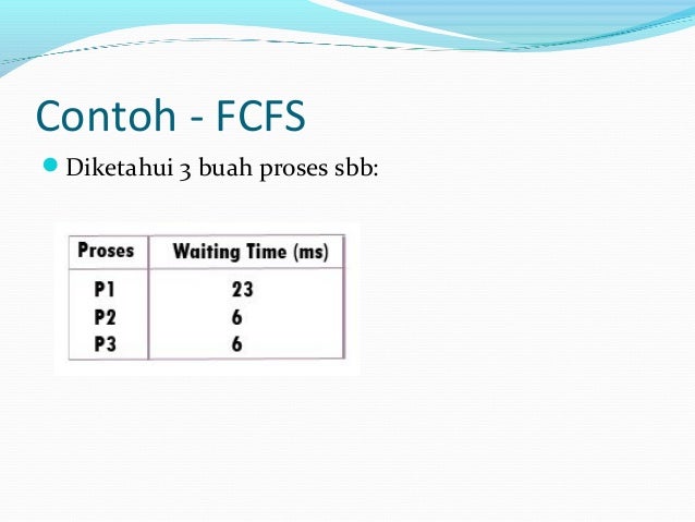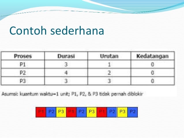 Contoh 4 Untuk memahami dari cara kerja algoritma penjadwalan Round Robin inimari kita kerjakan soal berikut 42. Hitunglah waiting time rata-rata danturnaround time burst time waiting time dari ketiga proses tersebut dengan menggunakan algoritma FCFS. Karena P2 P1 maka proses.