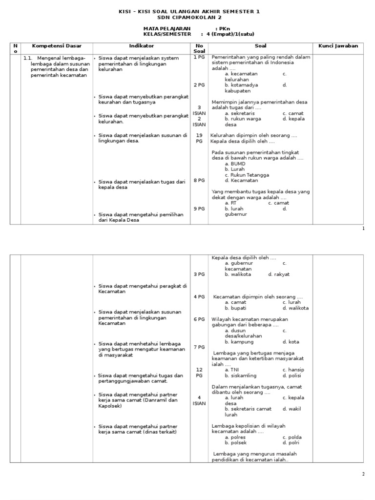 Kisi Kisi Soal Uas Pkn Kelas 4 Smtr 1