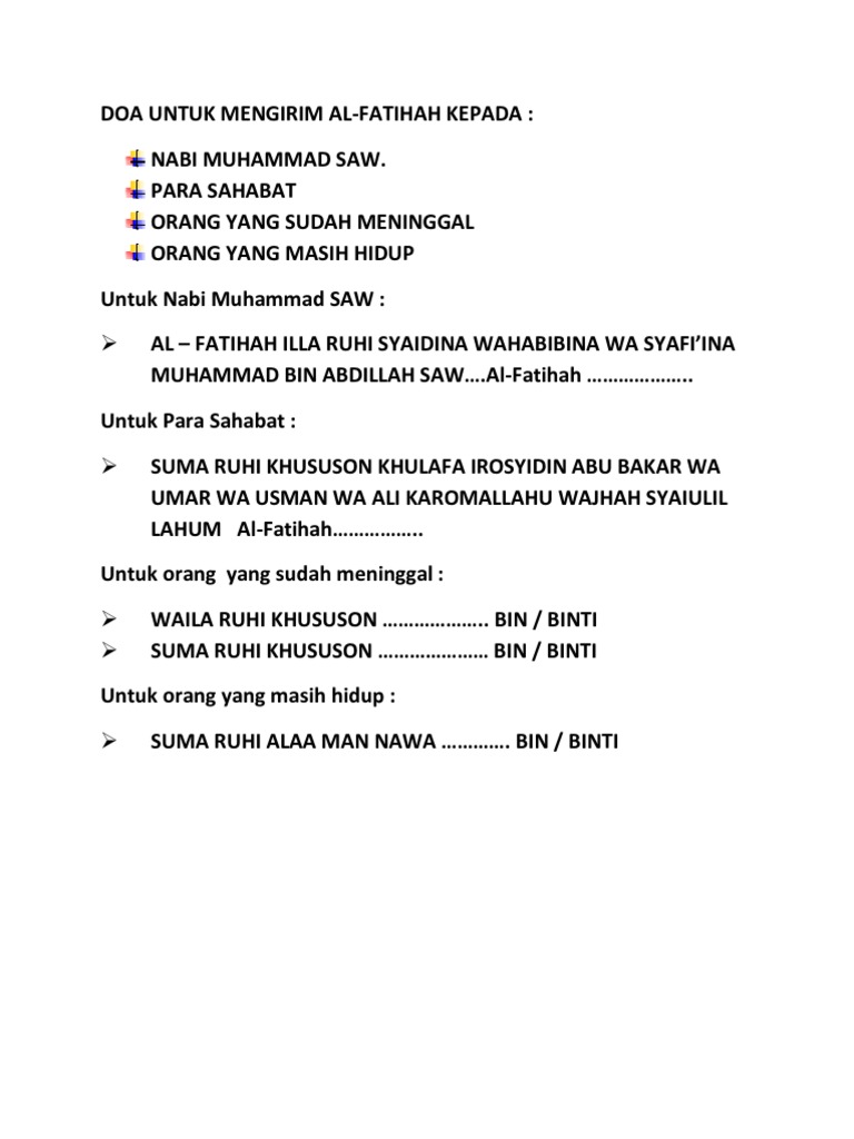 Suma ruhi khususon khulafa irosyidin abu bakar wa umar wa usman wa ali karomallahu wajhah syaiulil lahum alfatihah. Jika ayah yang meninggal bacakan doa untuk laki-laki. Dan telah dibahas pada pertemuan yang lalu tentang hadits talqin.
